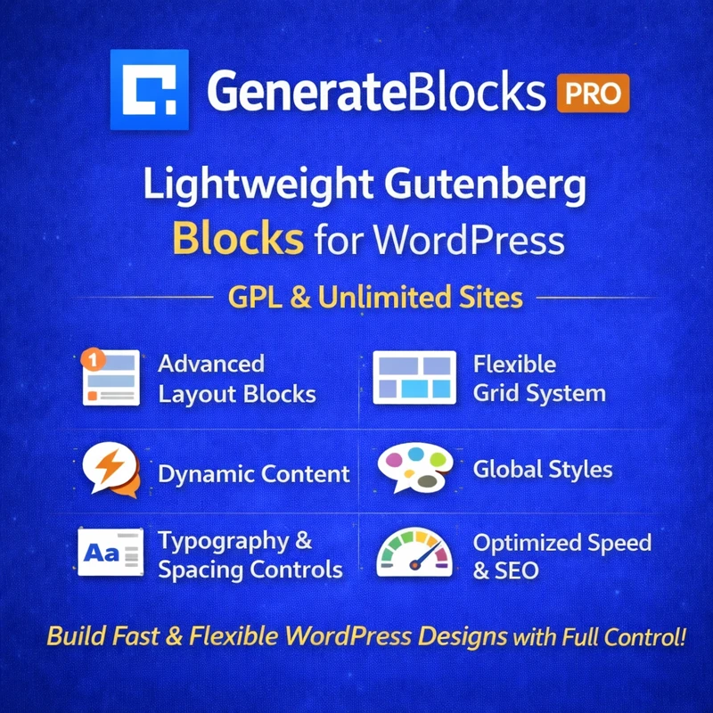 GenerateBlocks Pro is a lightweight and performance-focused WordPress block plugin built for the Gutenberg editor. It allows you to create advanced layouts, landing pages, and custom designs using clean, fast, and flexible blockswithout relying on heavy page builders.